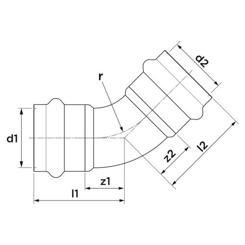 Vsh SudoPress Koper bocht 45° Ø54x54mm SP5041V fitting met 2 aansluitingen 1-delig, lengte 126mm, bocht, uitwendige buisdiameter aansluiting 54mm, nom. diameter aansluiting 1 DN 50, aansluiting 1 koper, uitwendige buisdiameter aansluiting 54mm, aansluiting 1 persmof, nom. diameter aansluiting 2 DN 50
