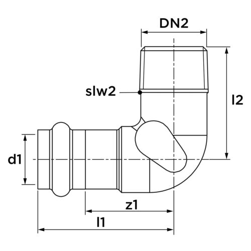 VSH SudoPress Koper kniekoppeling 90° Ø15xR1/2″ fitting met 2 aansluitingen 1-delig, lengte 54mm, bocht, uitwendige buisdiameter aansluiting 15mm, nom. diameter aansluiting 1 DN 12, aansluiting 1 brons, uitwendige buisdiameter aansluiting 21.3mm, aansluiting 1 persmof, nom. diameter aansluiting 2 1/2″ (15)